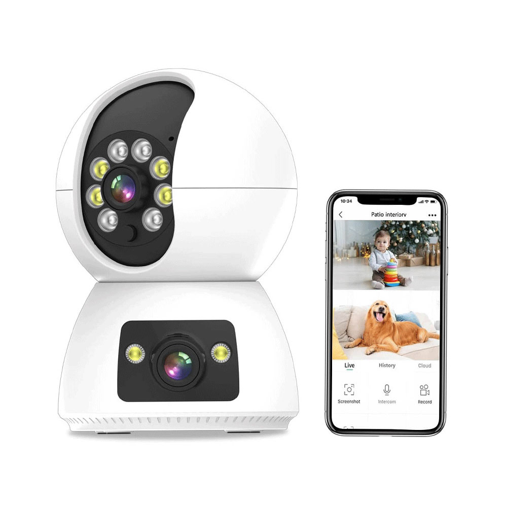 Esta cámara de seguridad de doble lente wifi 2.4g tiene dos cámaras, puede monitorear 2 áreas diferentes al mismo tiempo, lo cual es más flexible y conveniente que las cámaras tradicionales. La cámara de interior wifi de doble lente se puede controlar de forma remota por APP gratuita "Tris Home" y "ICSee".