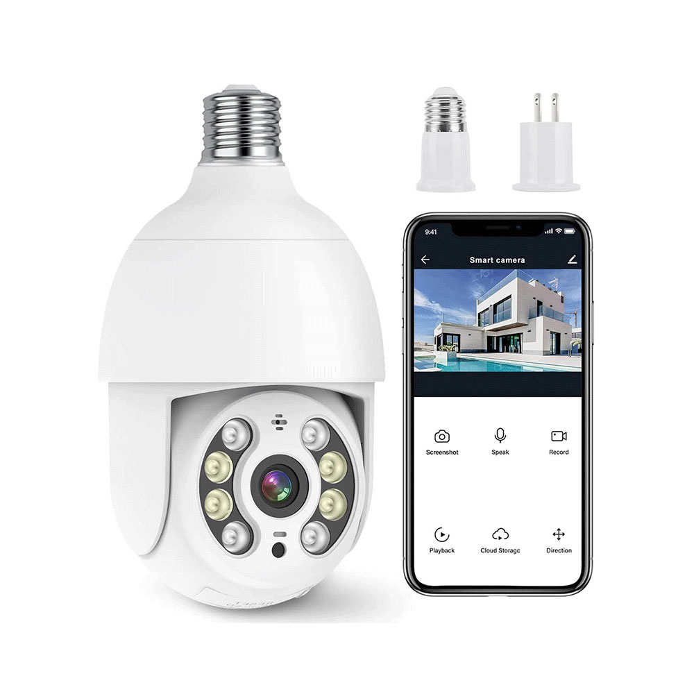 La cámara de seguridad para el hogar PTZ admite una rotación horizontal de 355 ° y una rotación vertical de 95 ° La cámara con bombilla adopta un sensor de movimiento altamente sensible, conecta la cámara a WIFI, cuando se detecta un objeto en movimiento, registrará Imagen en movimiento y te notifica a través de la aplicación.